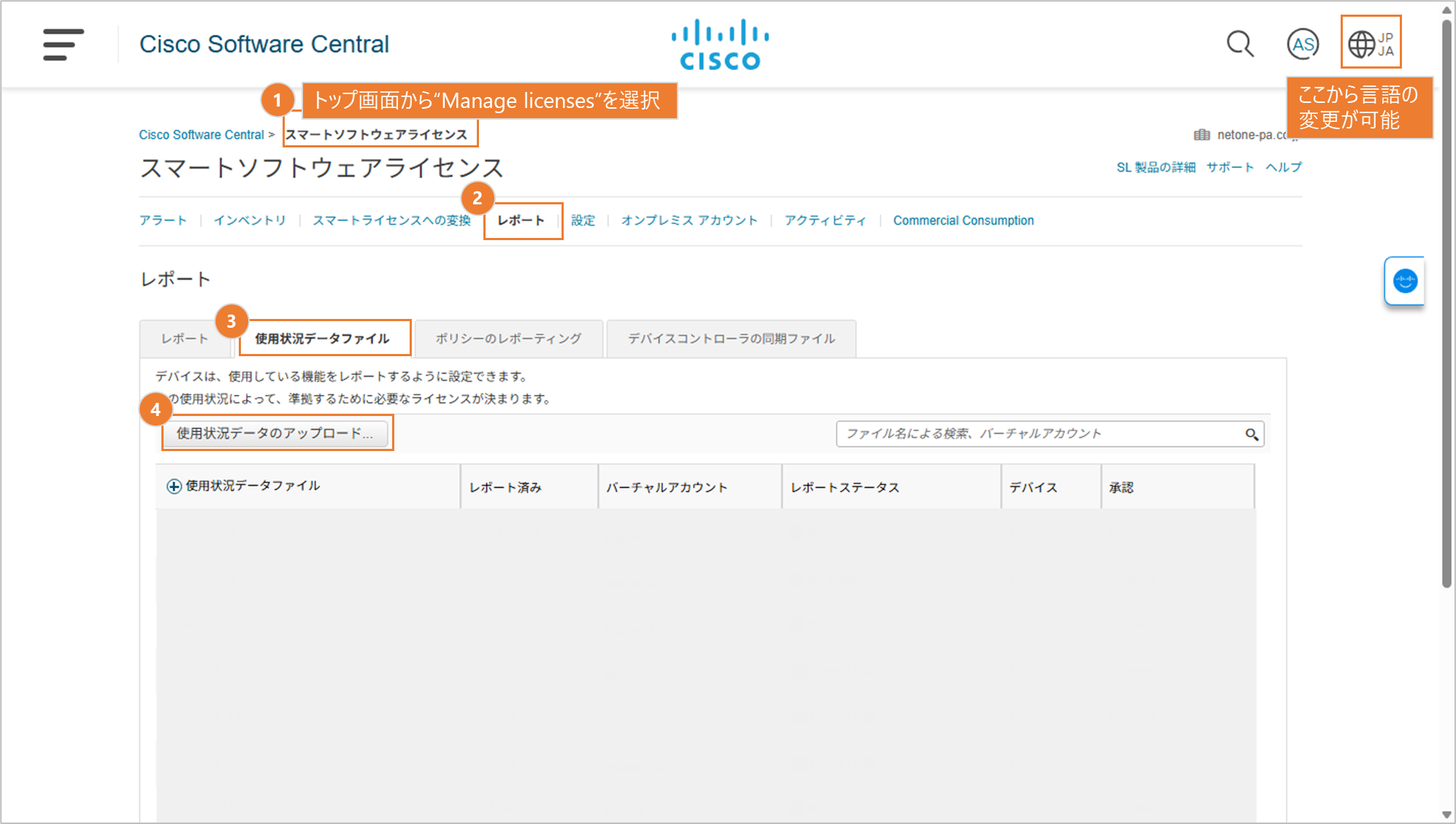 次にCSSMのWebポータルであるCisco Software Central(https://software.cisco.com)にアクセスします。Webポータルの画面で下記の説明のように選択して、「スマートソフトウェアライセンス」の「レポート」の画面を表示し、レポートファイルをアップロードします。こちらの画面は右上のアイコンから日本語化が可能で、以下は日本語の場合で解説しています。