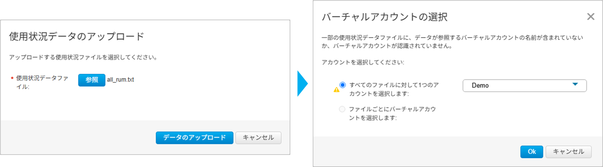 レポートファイルのアップロード用の画面が表示されるのでファイルを選択し、機器を登録するバーチャルアカウント(VA)を指定してレポートファイルをアップロードします。