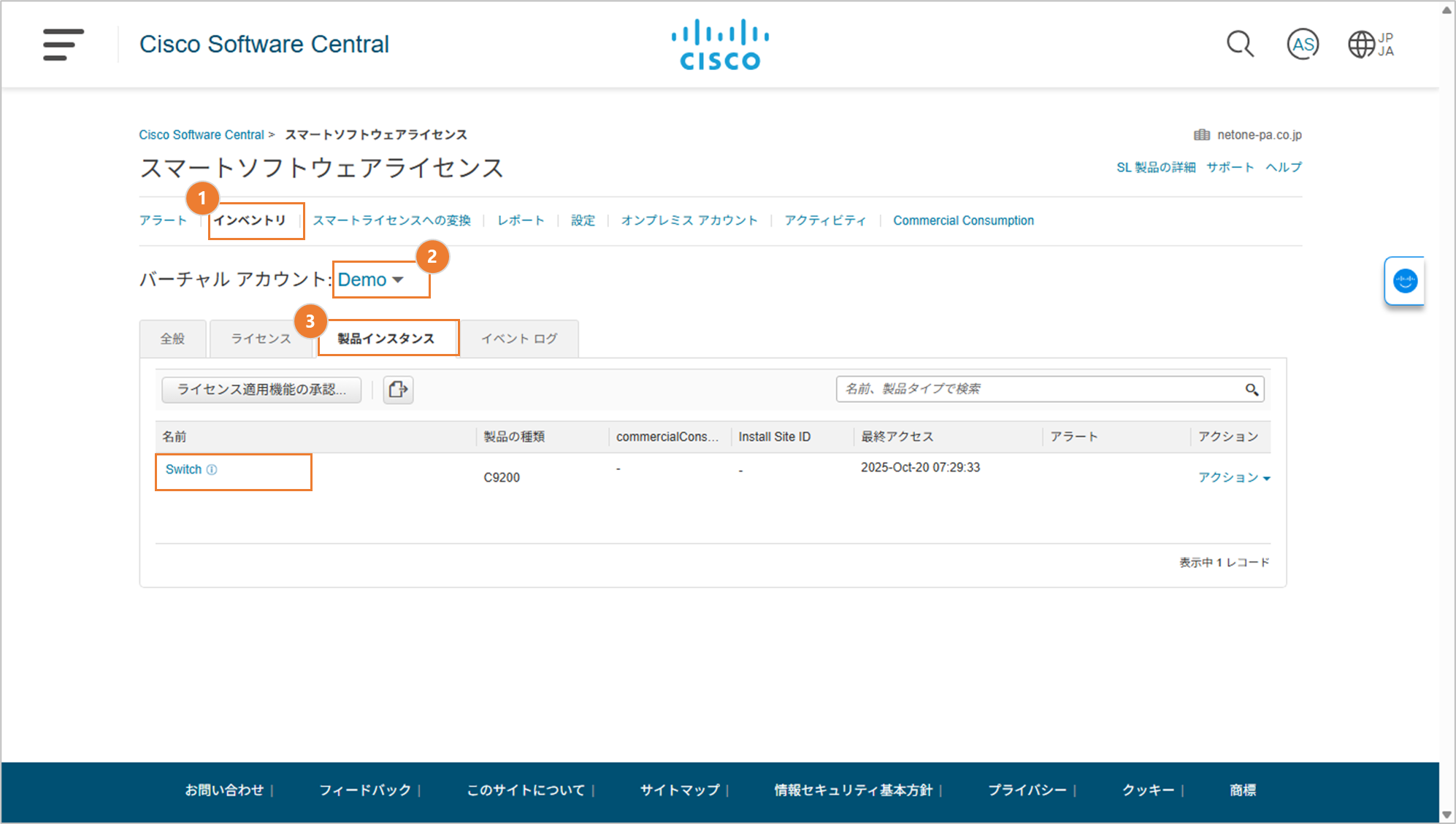 また、ここまでの操作が完了すると「インベントリ」タブで製品インスタンスが登録されていることを確認することが出来ます。