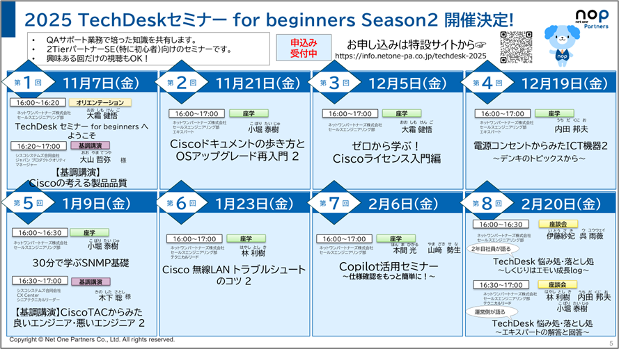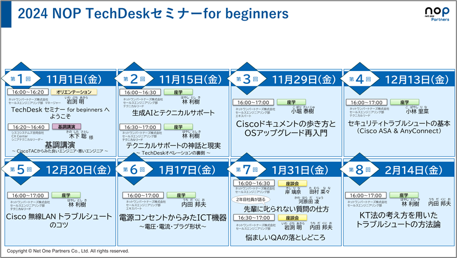なお、毎回冒頭にTechDeskのサポートサービス条件や会員制ポータルサイト「NOP TECH INFO」の紹介や、他チームのセミナーの案内をしています。これらはいわば、映画の本編上映前の緒注意と近日公開作品の予告編のようなものでしょうか。
