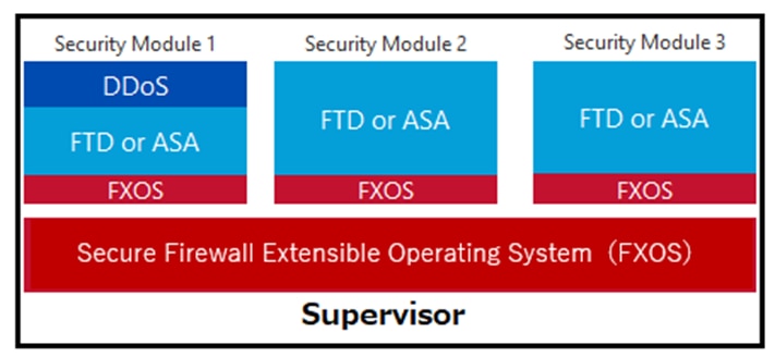 FXOSとはハードウェアの制御やリソース管理を担うプラットフォームOSです。このFXOSという土台の上で、ファイアウォール機能(FTDやASA)がアプリケーションとして稼働する仕組みになっています。