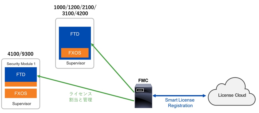 FMCが 管理デバイス(FTD)にライセンス割当てと管理を行います。