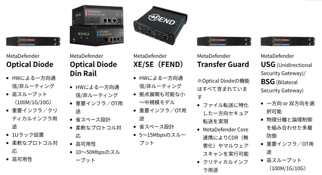 OPSWATは、重要インフラ向けセキュリティを主軸とするベンダーとして、MetaDefender Netwall ブランドで複数のデータダイオード製品を提供しています。